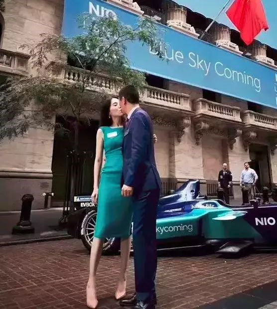 2018年9月12日,蔚来汽车在纽交所成功上市。彼时,李斌与妻子王屹芝在纽交所门外的百老汇大街深情对视,王屹芝一袭蔚来蓝连衣裙,被李斌霸道总裁拥吻。