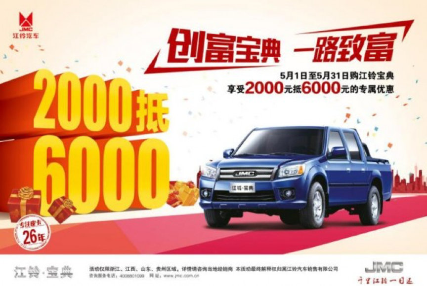 那么,现在购买正是时候,专注皮卡26年的江铃汽车,旗下江铃·宝典推出钜惠活动,5月1日-5月31日购买江铃·宝典,就可以享受2000元抵6000元的专属优惠,需要注意的是本次优惠活动有区域限制,仅限浙江、江西、山东和贵州区域。
