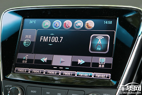 对于日常使用最多的收音机功能我们也进行了测试,通过选择主屏幕的多媒体选项或者直接点击屏幕下方的RADIO按键,都可进入到收音机系统。该系统界面标识简洁清晰,在下部还有预设好的电台频道,只要轻轻点击就可收听相关频道的节目。在调节电台时,点击屏幕下方的前进后退标识以及频道上下两个三角标识便可搜索自己想要的频道。另外,屏幕下方的多媒体按键也可对其进行控制调节,按键手感较为紧实,阻尼感较强。