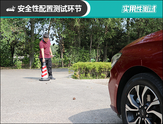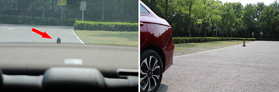 在测试前方视野阶段,我们采用高70cm的桩桶作为参照物,随后调整车距,直至在主驾驶位可以看到桩桶上沿。经过测试,桩桶与车头最终测得的数据为180cm,由于其较小的车身尺寸以及短车头设计,获得了相当出色的实测成绩。