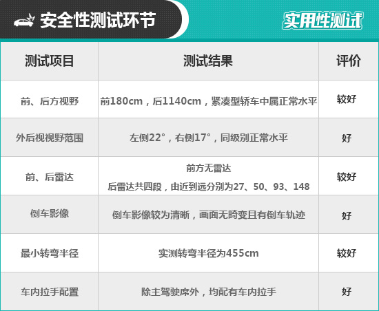在车辆前、后方视野测试中,车内所有座椅均已调整至最低状态,所测出的数据与驾驶者正常使用时均有一些偏差,仅供参考。