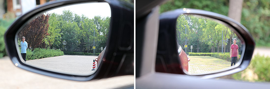 雪佛兰科鲁泽后视镜虽然没有采用双曲率设计,但宽大的镜面同样能带来良好的视野观察范围,几乎没有畸变,最终测得结果为左侧为22°,右侧为17°。