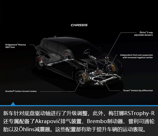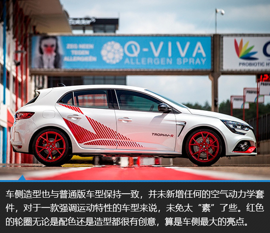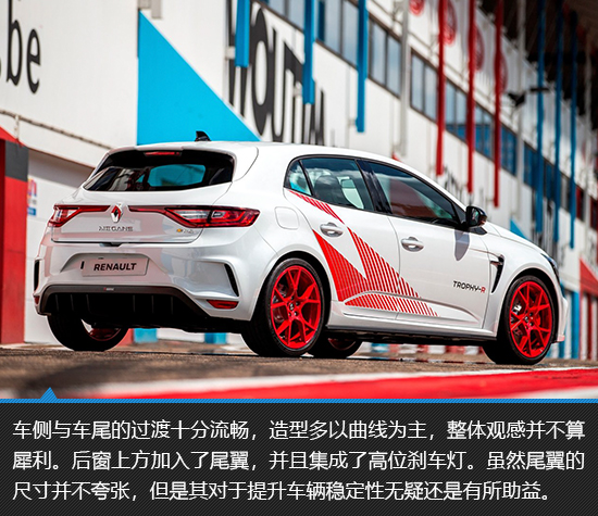 外观方面,梅甘娜RS Trophy-R相当低调,除了车身随处可见的专属拉花以外,整体设计与普通版车型并无不同,甚至连额外的运动套件也没有。特殊的车身装饰使新车的“赛道感”极为强烈,也许梅甘娜RS Trophy-R看起来并不是狠角色应该有的样子,但是其由内而外所散发出来的气场却依然十分强大,而且极具杀伤力。