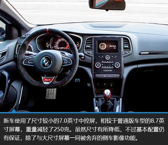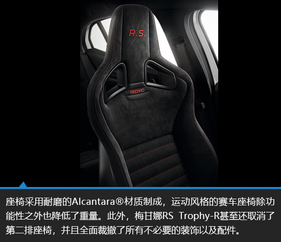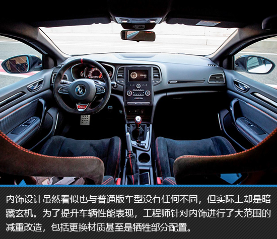 梅甘娜RS Trophy-R内饰基本延续了普通版车型的设计,不过为了减重,新车更换了小尺寸中控屏以及取消第二排座椅,以降低车重的方式提升车辆动态表现。不过从简配而非取消触控屏这一点来看,Trophy-R版车型也并非是极端激进的设计,它至少还是保留了一些基本的实用性配置,这对于消费者来说,无疑是件好事儿。
