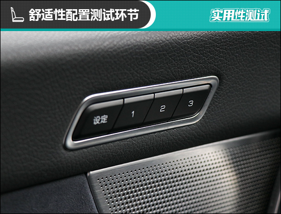 测试车带有三组座椅记忆功能,而且还带有舒适进入功能。调节好座椅位置后,按下设定按键再选择数字键,即可完成当前座椅位置的记忆。重新设定也是同样的操作流程,系统会自动进行覆盖,简单方便。设置成功以后,恢复座椅位置仅需要点按对应的数字按键即可。设置时,液晶仪表内会提示设置成功,非常直观。前排两张座椅均配备了电动调节、加热以及通风功能,其中主驾驶位还加入了腰部支撑的调节,配置表现较为出色。