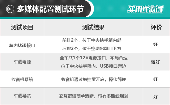 比亚迪宋Pro DM全车共有四个USB接口,前后排各两个。我们对每个USB接口的电压与电流进行了测试。其中,前排USB接口电压为4.79V,电流为0.74A;后排USB接口电压为4.97V,电流为0.97A。实测前后排USB接口充电功率相差不大。不过,扶手箱内的充电专用接口,功率会比较大一些,适合给电子设备进行充电。此外,车内还提供了1个12V电源接口,位于前排中央扶手箱内,USB接口旁边。