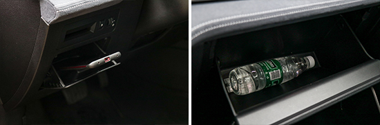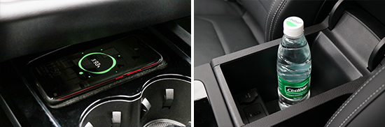 比亚迪宋Pro DM前排储物空间较为丰富,不仅数量多,而且容积也都比较大。杯架带有限位器,而且中控台下方还配有无线充电板。