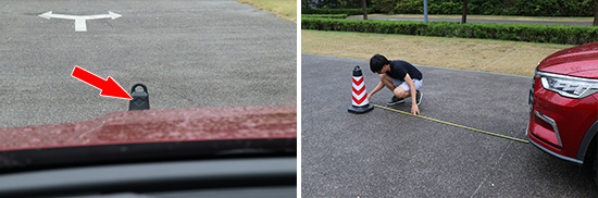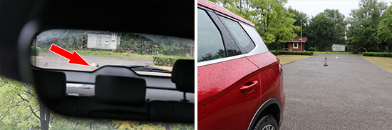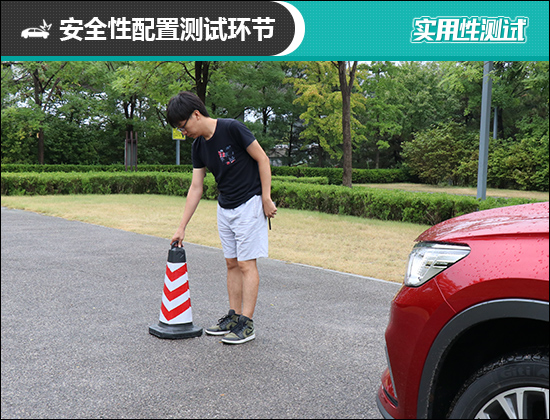 在测试前方视野阶段,我们采用高70cm的桩桶作为参照物,随后调整车距,直至在主驾驶位可以看到桩桶上沿。经过测试,桩桶与车头最终测得的数据为222cm,成绩非常优秀,在测试过的同级别车型中也处于上游水平。