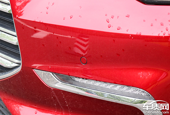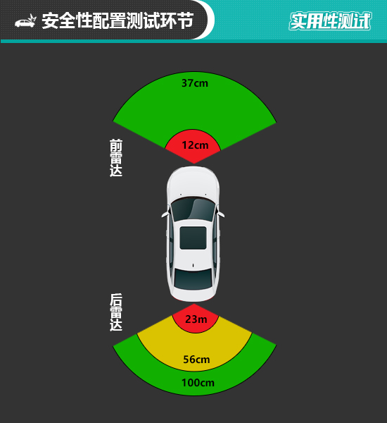 前雷达分为2段,最远的探测距离为37cm。前雷达持续蜂鸣提示距离为12cm,相比设定的标准值小很多。值得注意的是,新车前端仅有两侧装配了雷达,所以其主要针对的是两侧45°的障碍物,在停车或是转弯时发挥作用。经实测,车前正面的障碍物雷达无法探测到。