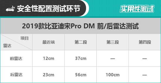 在测试过程中,后倒车雷达共分三段,最远在100cm处开始感应到后方物体,雷达功率表现中规中矩。后续每段距离间隔掌握较为均匀,易于驾驶者做出判断。在测试标准中,持续蜂鸣阶段越接近25cm则越贴近日常使用习惯,从实测数据来看,比亚迪宋Pro DM持续蜂鸣提示距离为23cm,比标准值略小一些,在实际测试过程中影响不大。