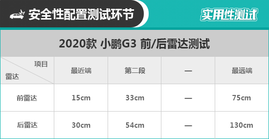 小鹏G3前雷达提示音同样分为三段,最远能在75cm处感应到前方70cm高的桩桶,最近感应距离为15cm。对于驾驶者来说,当前雷达第二段提示音响起时就应该停车,以防与障碍物距离过近,因刹车不及时而发生碰撞。