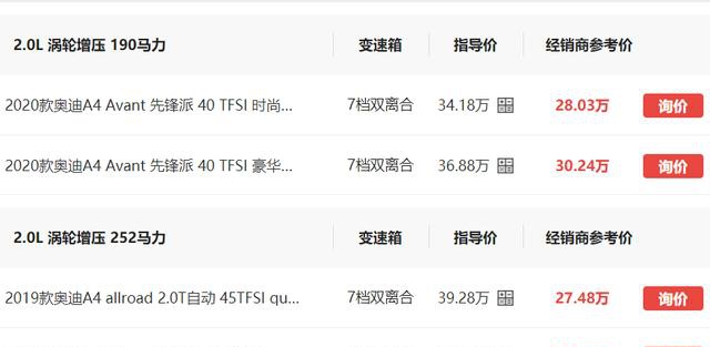 奥迪A4为进口车型,外观与自家RS 4性能车型高度相似。车身尺寸为4737*1842*1428mm,轴距为2825mm,内饰与国产三厢A4L相同,圆润饱满的车尾是奥迪A4 allroad的标志性特征,宽厚的尾箱是实用的代表。配备了LED头灯、电动尾门、全景天窗、无匙进入、一键启动、前排侧气囊、前后排侧气帘、前后泊车雷达、倒车影像、驾驶模式、全液晶仪表盘、前排座椅加热、自动空调、后排独立空调等。奥迪A4(进口)搭载2.0T涡轮增压发动机,匹配7速双离合变速箱。