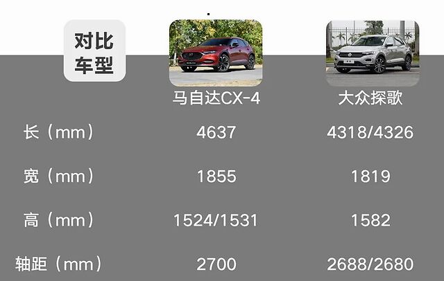 通过数据来看,马自达CX-4除了高度不及大众探歌外,其在长度、宽度以及轴距方面均占据优势。