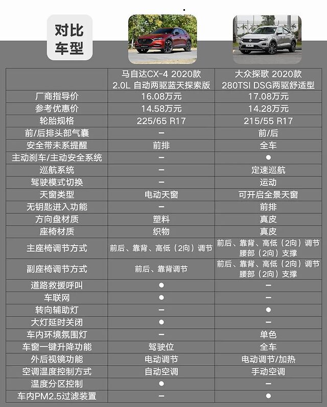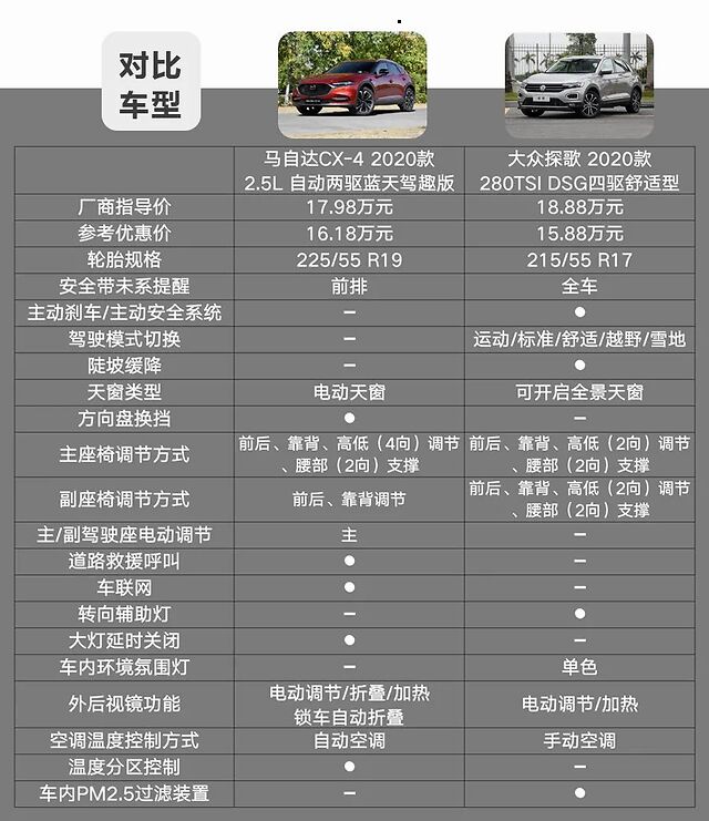 综合而言,马自达CX-4与大众探歌的实力均可圈可点,且外观设计也都较为亮眼;但若是两者的内饰设计以及配置层面能够进一步跟进,相信会更具竞争实力。最后,作为消费者的你会更喜欢哪款车型呢?