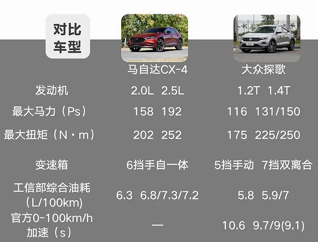 马自达CX-4提供2.0L与2.5L两套动力可选,而大众探歌则提供1.2T与1.4T高/低功率三种动力选择。