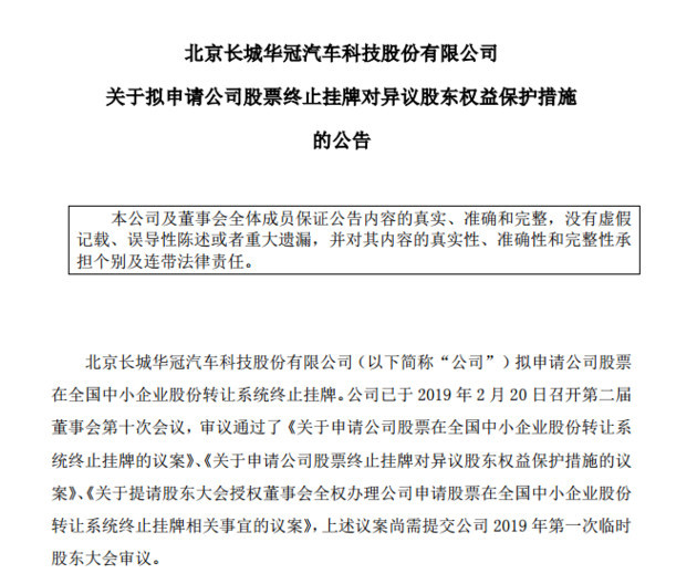 2月20日,北京长城华冠汽车科技股份有限公司(833581)(以下简称长城华冠)发布关于拟申请公司股票终止挂牌对异议股东权益保护措施的公告,拟申请公司股票在全国中小企业股份转让系统(即新三板)终止挂牌。上述议案尚需提交公司2019年第一次临时股东大会审议。