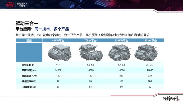 据了解,目前驱动3合1分为4个平台,基于e平台诞生的第一款纯电动SUV元EV360就应用于B平台下,未来还会在e平台下面的C平台、B平台、A平台、A+平台使用。对于消费者而言,这种解决方案使其购车成本会降低,车内空间会提高,整车能耗更低。