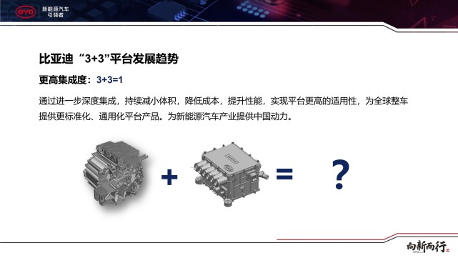 从比亚迪工程师的角度来看,要在“33111”的基础上进一步深度集成,持续减少体积,降低成本提高性能,就集中在3+3(驱动+高压)=1 ,这个新的技术问题上了。