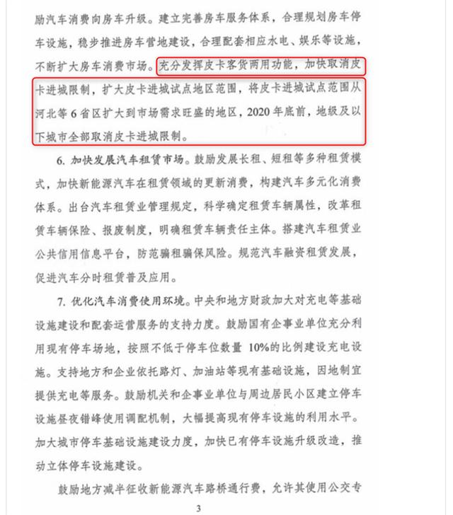 除2018年底出台的相关政策之外,2019年4月11日,国家发改委又发布了《推动汽车、家电、消费电子产品更新消费促进循环经济发展实施方案(2019-2020年)(征求意见稿)》,其中明确指出:充分发挥皮卡客货车两用功能,加快取消皮卡进城限制,扩大皮卡进城试点地区范围,将皮卡进城试点范围从河北等6省,扩大到市场需求旺盛的地区,2020年底前,地级及以下城市全部取消皮卡进城限制。虽然仅仅是一份“征求意见稿”,但也同样让广大皮卡车迷看到了一丝曙光。