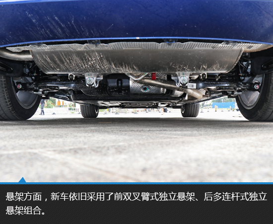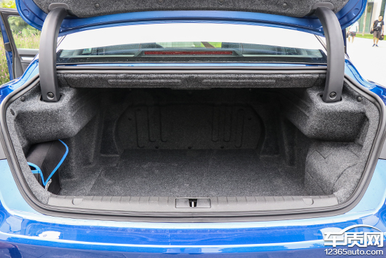 后备箱地台十分平整,右侧轮拱侵占些许容积,将后排座椅比例放倒后可与地台形成完整平面。抬起后备箱盖板后,下方储放的是一个非全尺寸备胎,同时,盖板可扣在后备箱上檐处,细节处考虑到位。