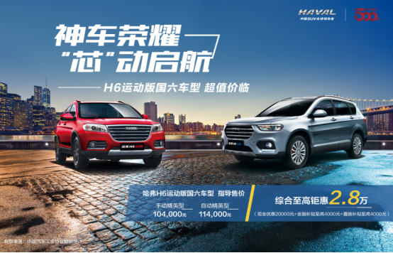 一直以来,哈弗H6运动版凭借其硬核产品力和超高性价比,深受众多年轻家庭的青睐。据最新数据统计,截至到今年七月份哈弗H6车型年度累计销量已经突破20万辆,累计74个月SUV销量第一,实力派(参数|图片)种子选手哈弗H6运动版更是为这次销量做出了巨大贡献。为了惠及更多家庭,让“接送孩子上下学”不再是难题。刚刚上市的哈弗H6运动版国六车型手动精英型指导价10.4万元,自动精英型指导价11.4万元,还可享至高2.8万元综合优惠,绝对是诚意满满,让广大家庭购车无忧。