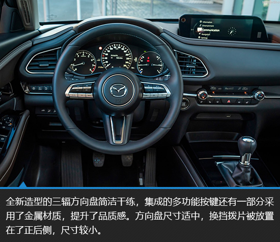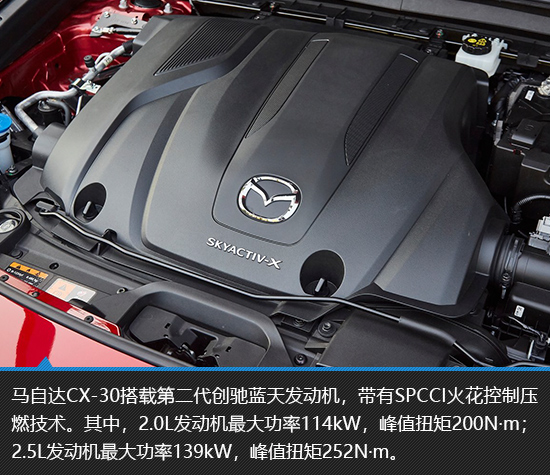 从目前的资料来看,马自达CX-30将搭载第二代创驰蓝天发动机,有2.0L和2.5L两个排量可选,而SPCCI火花控制压燃技术无疑将会成为其最大亮点。除了传统的动力系统之外,新增的M-Hybrid轻混系统也颇具看点,能够为新车带来更好的燃油经济性。虽然海外版车型的动力总成十分亮眼,但结合全新马自达3进入国内市场后的一系列操作来看,未来国产版本的马自达CX-30将采用何种动力形式,目前仍是未知数。