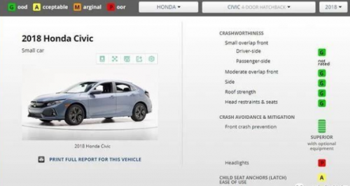 因为海外版没有途观L,所以我们选取了最新款途观的IIHS 测试成绩,和昂科威一样,同样是全G的成绩。而在国内的测试中,途观L的表现一般,在车内乘员和车外行人两个项目中只获得了M(及格)和A(良好)。东风本田思域