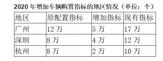 2020年3月25日,杭州市发布《关于2020年一次性增加小客车指标的配置公告》。杭州市2020年一次性增加的2万个小客车指标,按3:1的比例通过个人阶梯摇号和县(市)个人指标摇号的方式进行配置,即个人阶梯摇号15000个、县(市)个人指标摇号5000个。