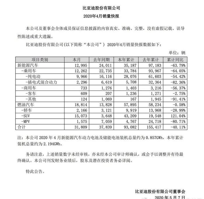 据比亚迪近期向股东披露的4月销量快报显示,比亚迪今年4月新能源乘用车型的销量为12262辆,环比销量大幅骤减,较去年同期下降63.79%。其中,纯电动车型占据销量大头,为9966辆;而插电式混合动力车型则为2296辆。