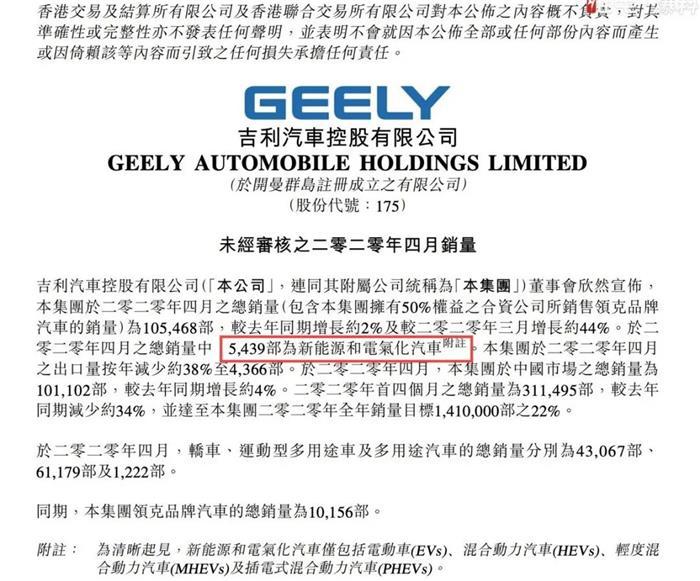 吉利汽车今年4月新能源车销量为5439辆,但这一数据并不准确,因为其采用的是弱混+新能源车型共计的方式。其中,新能源车板块的销量大头由帝豪EV和帝豪GSe做支撑。