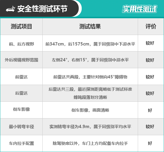 在车辆前、后方视野测试中,车内所有座椅均已调整至最低状态,所测出的数据与驾驶者正常使用时会存在一些偏差,仅供参考。