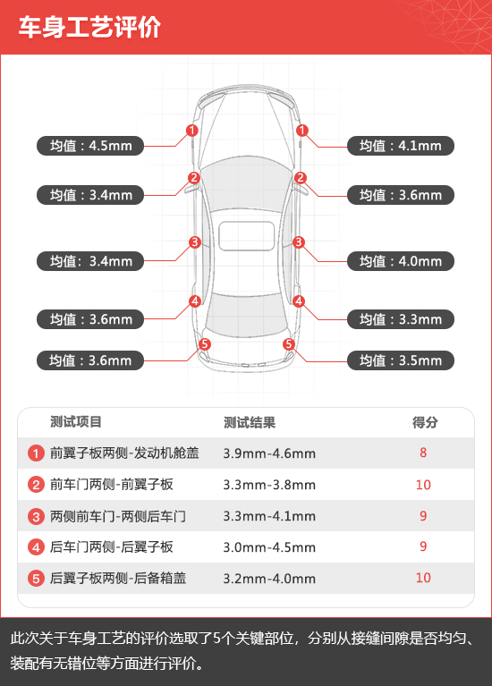 在测试中,每个关键部位都会选取3个关键点进行测量,以评价各关键部位缝隙的均匀程度。从测试结果来看,2019款天籁的全车各个测试点间的缝隙数据均匀度表现不错,工艺比较令人满意,其数值与同级别豪华品牌车型的实测数值非常接近。其中,左前翼子板与发动机舱盖连接处、右前翼子板与发动机舱盖连接处两个部位的缝隙数据均值较大,分别为4.5mm和4.1mm,但与其他部位相差不大,对总体结果影响微乎其微。