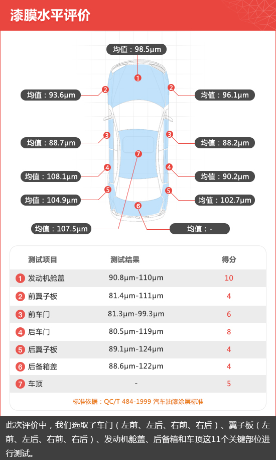 通过测试结果可以发现,2019款天籁整车漆膜平均厚度约为97.9μm,高于中级车标准值(≥90μm),整体表现值得肯定。
