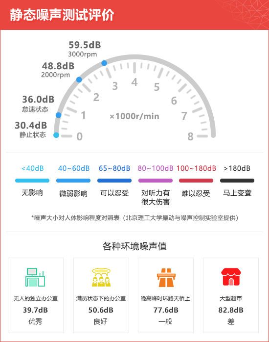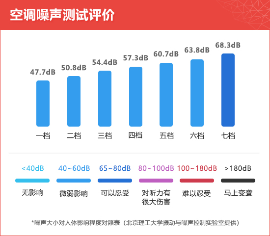 经过测试可以发现,随着空调风量的增大,噪声也逐渐增大,风量在一至四档时噪声控制比较出色,超过五档后噪声略高,但始终维持在人体可以忍受的范围内,总体表现令人满意。