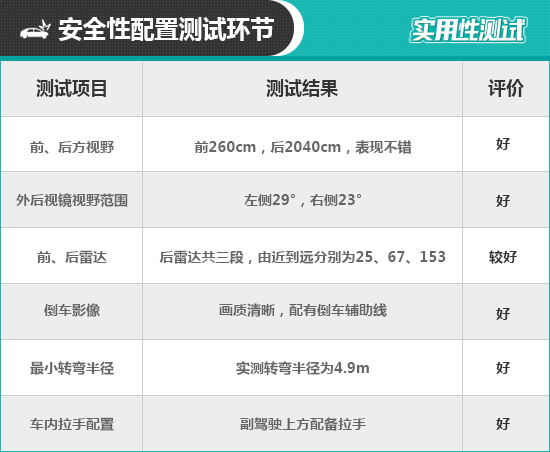 在车辆前、后方视野测试中,车内所有座椅均已调整至最低状态,所测出的数据与驾驶者正常使用时均有一些偏差,仅供参考。