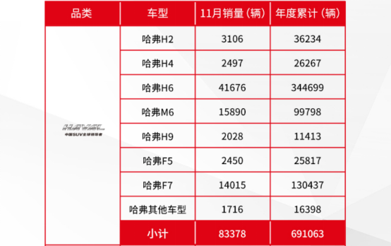 近日,长城汽车公布最新销量数据,11月单月总销量高达115,162辆,年度累计销量同比劲增3.81%,达到954,290辆,与既定的107万辆年度目标仅有咫尺之遥。其中哈弗持续逆市上扬的表现,11月销量达到83,378辆,再度将SUV市场销冠收入囊中。至此,哈弗年度累计销量已达到691,063辆,同比增长4.95%,再度超越自我,成就“每1分钟便有1台哈弗SUV售出”的销量奇迹,成为名副其实的中国汽车销冠品牌。