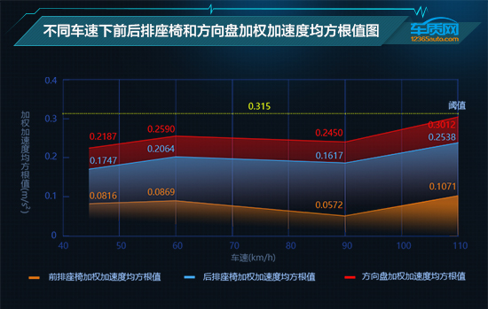 从测试结果来看,车速在45km/h-90km/h范围内变化时,前后排座椅加权加速度均方根值随车速变化均呈现出了先升后降的趋势。但当车速超过90 km/后,前后排数值由降转升,且后排数值增长幅度较前排更高。不过,在测试车速范围内前后排座椅加速度均保持较低的水平,始终未超过0.315 m/s2的阈值,乘员不会有“不舒服的感觉”,前排舒适度尤其较好,可见2020款东风日产轩逸在铺装路面的驾驶舒适性还是非常值得肯定的。另外,方向盘处的加权加速度均方根值随测试车速45km/h—110km/h变化的规律与前后排座椅相同,且始终未超过0.315 m/s2的阈值,表现令人满意。