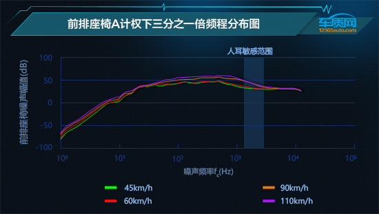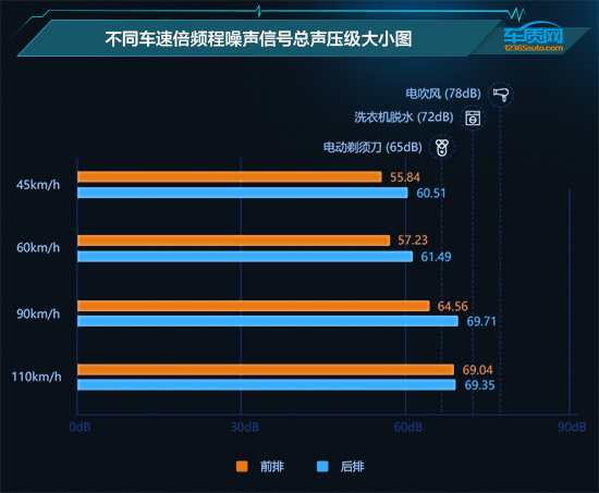 从上图的不同车速噪声的总声压级大小来看,在测试过程中,2020款东风日产轩逸的噪声信号大小始终维持在55dB至70dB之间。随着速度不断增加,在110km/h时噪声总声压级达到最大,且后排座椅噪声明显高于前排座椅。为了让大家更为直观地了解车辆在行驶过程中的噪音大小,我们结合日常生活中可以接触到的声音来进行比较,如电吹风在运行时的噪音为78dB,洗衣机在脱水时的噪音在72dB上下,而电动剃须刀的工作噪音约为65dB。可见在测试过程中,传入2020款东风日产轩逸车内的噪音对乘员舒适性影响非常有限。