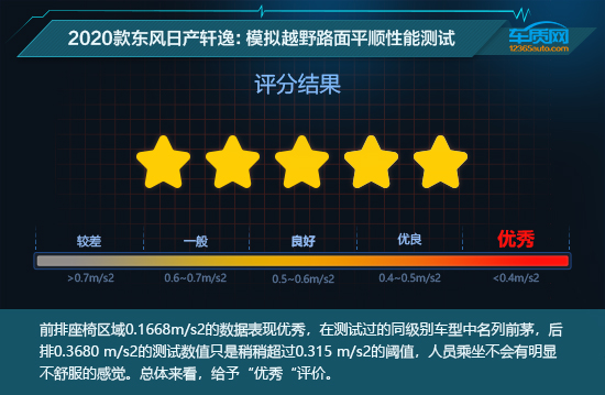 2020款东风日产轩逸定位为紧凑型轿车,虽然不具备越野能力,但日常使用难免会遇到坑洼不平的路面,因此我们同样对其进行了模拟越野路况测试。从测试数据来看,前排座椅区域0.1668m/s2的数据表现优秀,在测试过的同级别车型中名列前茅,后排0.3680m/s2的测试数值只是稍稍超过0.315m/s2的阈值,人员乘坐不会有明显不舒服的感觉。前排导轨的加权加速度均方根值为0.4776m/s2,与前排座椅间的差值为0.3108m/s2,侧面说明了2020款东风日产轩逸前排坐垫填充物拥有较为出色的缓冲效果。此外,前排座椅与后排座椅间的差值为0.194m/s2,因此在遇到落差较大的颠簸时,前排舒适性表现明显优于后排。