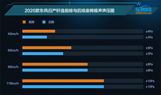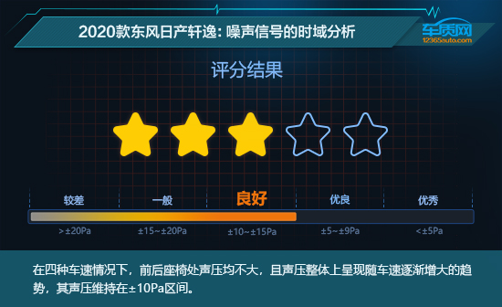 在测试阶段,我们将车速分别定在45km/h、60km/h、90km/h和110km/h四个速度区间分别取样。当低速行驶在城市道路时我们可以看到,2020款东风日产轩逸前后座椅声压维持在±6Pa以内,噪音控制表现优良。随着车速上升,噪声声压值也逐渐上升,相邻差值越大,说明振动幅度越明显,人耳也越容易感到不舒适。测试过程中,2020款东风日产轩逸的曲线虽然出现一定变化,但声压值始终保持在±10Pa以内,所以我们给予三星“良好”评价。